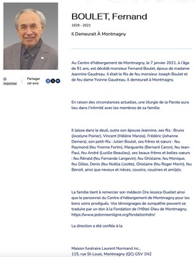 - Année et lieu du décès : 07-01-2021, Montmagny, QC